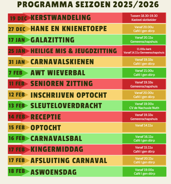 De activiteiten van CV de Veldkretsers worden elk jaar gehouden in het gemeenschapshuis en in café I gen Dörp. Bekijk onze agenda voor een totaaloverzicht.